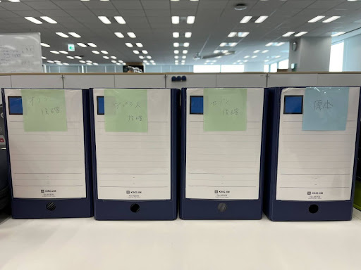 後確が完了した場合「A-12」番のキャビネットの保管されているため、随時ファイリングをする。