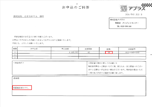 電話にてアプラスから保留連絡がくる。もし連絡がない場合はこちらからアプラスへ電話にて問い合わせをする。