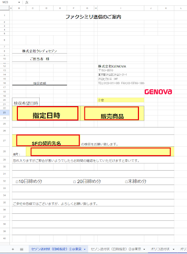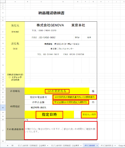 ・指定の電話番号欄は後確SSのJ列「連絡先」を確認し、勤務先宛であればSFの会社電話番号をコピペ。携帯宛であれば契約書を確認し、代表者の携帯番号を入力。