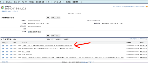 ②SFの”契約書管理”欄へ 顧客からのメールエビデンスをアップする。